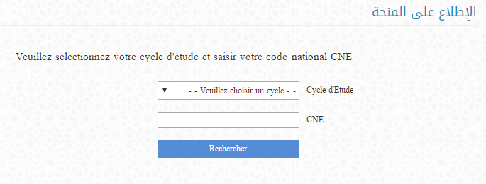 للإطلاع على وضعية المنحة المرجو الدخول ادخال السلك ثم الرقم الوطني للطالب ثم الضغط على بحث وستظهر لكم وضعيتكم في نافذة اخرى كما هو مبين في الصورة اسفله