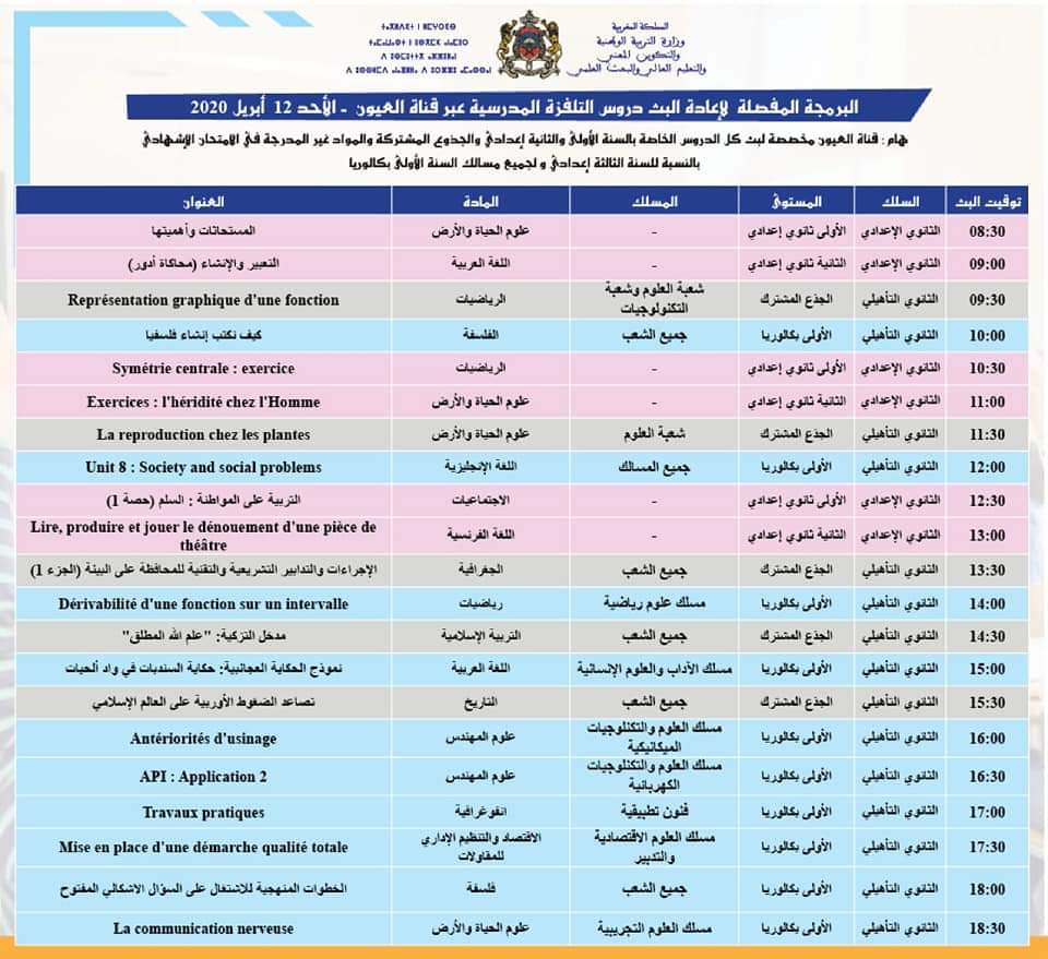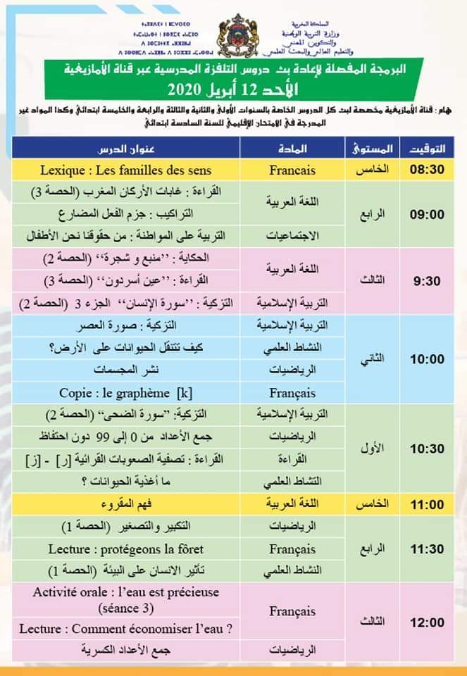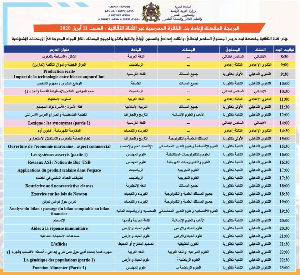 البرمجة المفصلة لإعادة بث دروس التلفزة المدرسية عبر قناتي » الثقافية » و « الأمازيغية » ليومي السبت والأحد 11 و 12 ابريل 2020