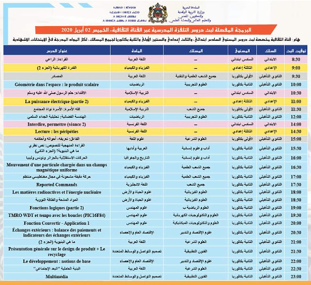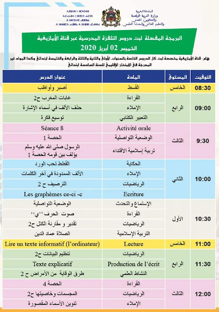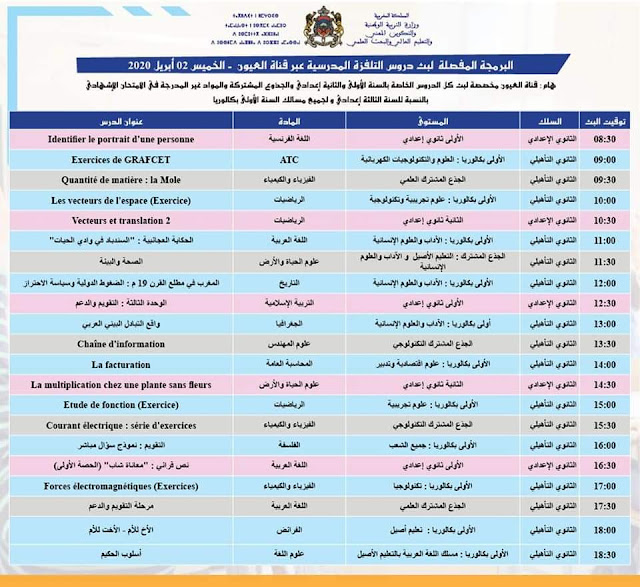 البرمجة المفصلة لبث دروس التلفزة المدرسية عبر القنوات التلفزية : الثقافية والعيون والأمازيغية ليوم الخميس 2 أبريل 2020