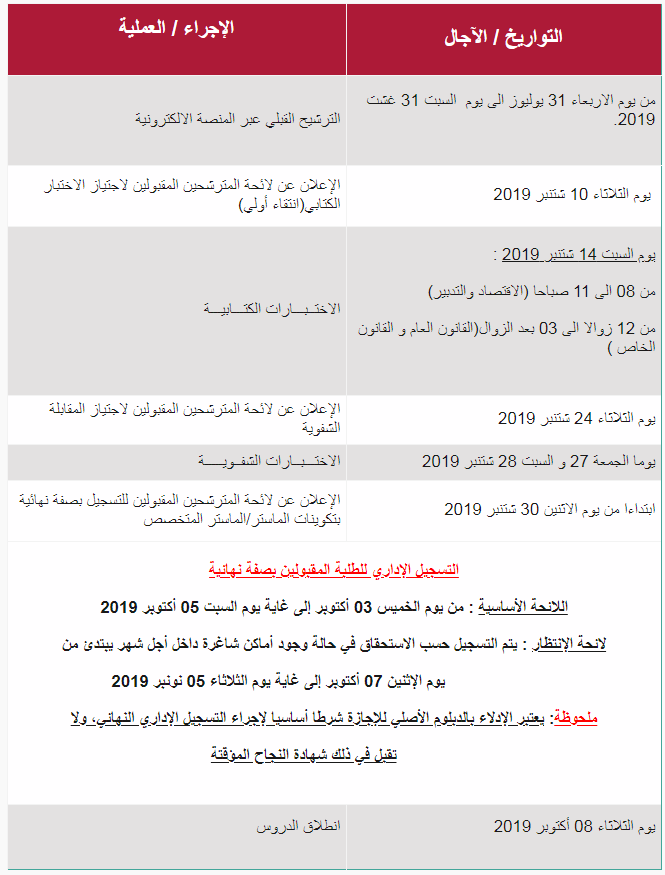 يعلن عميد كلية العلوم القانونية والاقتصادية والاجتماعية بفاس إلى كافة الطالبات والطلبة الحاصلين على الإجازة في العلوم الاقتصادية والتدبير و/أو العلوم القانونية (أو ما يعادلها في التخصص المطلوب) أنه بإمكانهم تقديم طلبات الترشح القبلي لاجتياز مباريات ولوج مسالك الماستر والماستر المتخصص برسم الموسم الجامعي 2019/2020 عبر منصة الترشيح بالموقع الإلكتروني للمؤسسة وفق المواعيد التالية:
