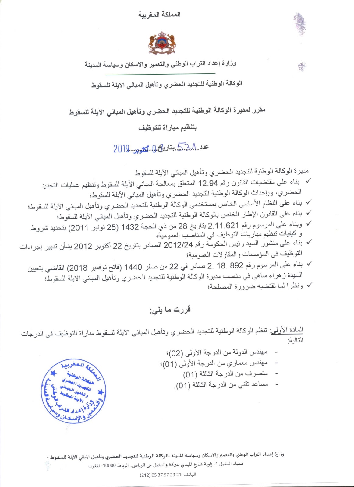 الوكالة الوطنية للتجديد الحضري وتأهيل المباني الآيلة للسقوط مباريات توظيف في عدة تخصصات – 04 مناصب آخر أجل 24 اكتوبر 2019
