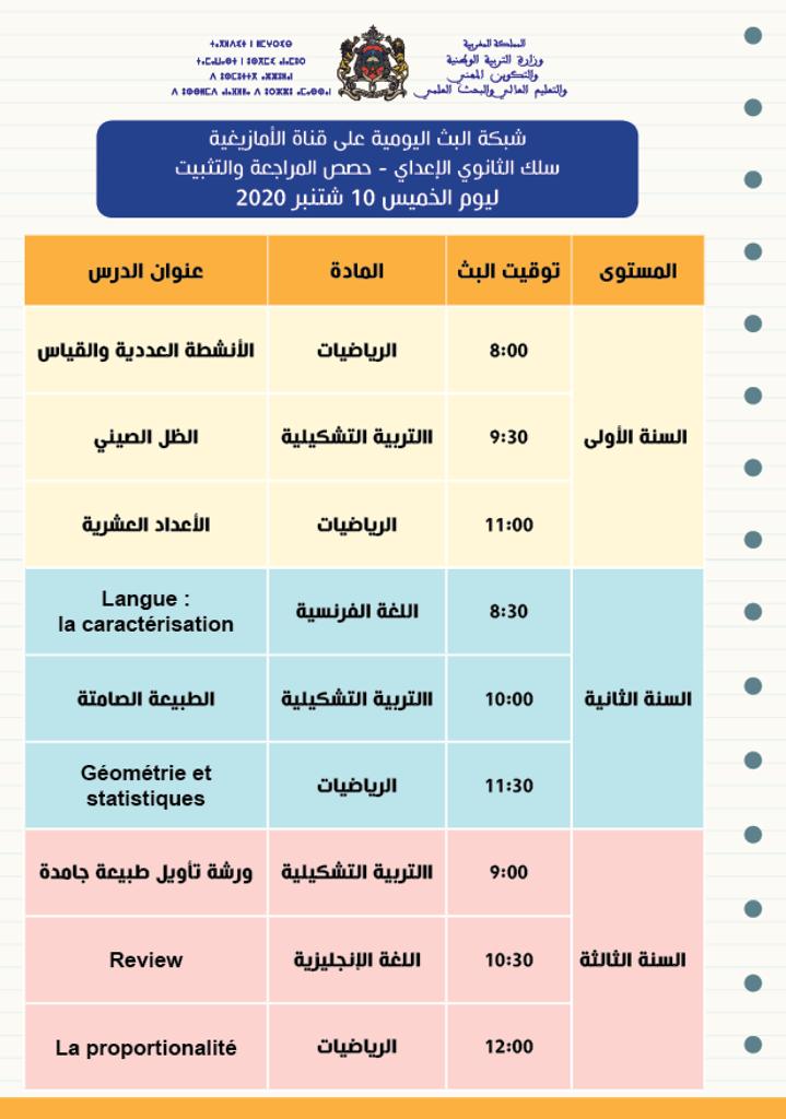 الأمازيغية : تخصص لبث حصص تهم المستوى التعليمي الثانوي الإعدادي من الساعة 8 صباحا إلى الساعة 12 والنصف زوالا.