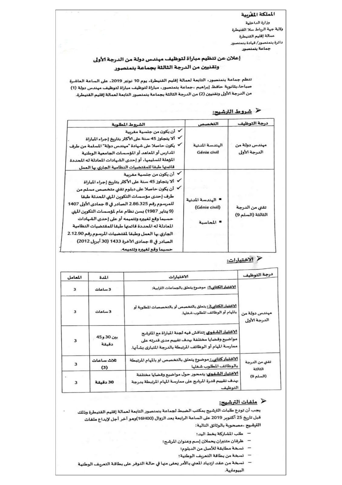 جماعة بنمنصور عمالة إقليم القنيطرة مباراة لتوظيف 01 مهندس دولة الدرجة الأولى و01 تقني من الدرجة الثالثة آخر أجل 25 اكتوبر 2019