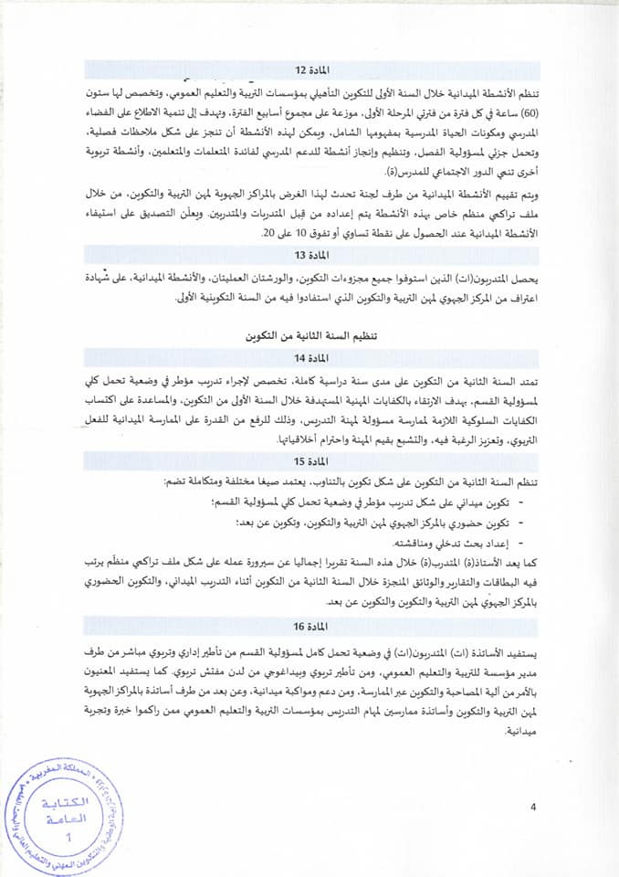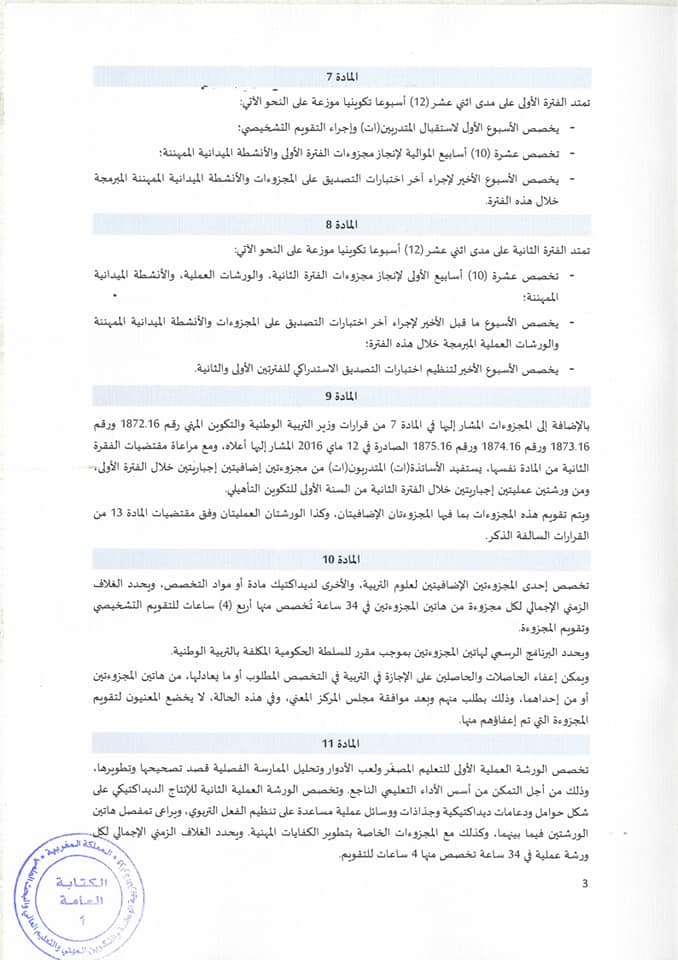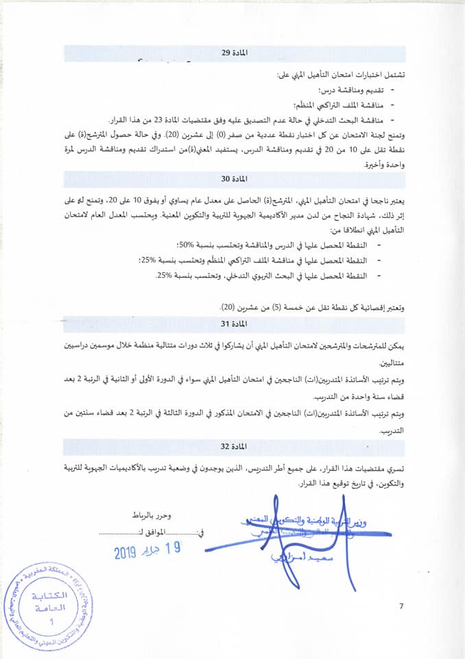 قرار لوزير التربية الوطنية والتكوين المهني والتعليم العالي والبحث العلمي بشأن تحديد كيفية تنظيم التكوين التأهيلي وامتحان التأهيل المهني لأطر التدريس المتدربين بالأكاديميات الجهوية للتربية والتكوين