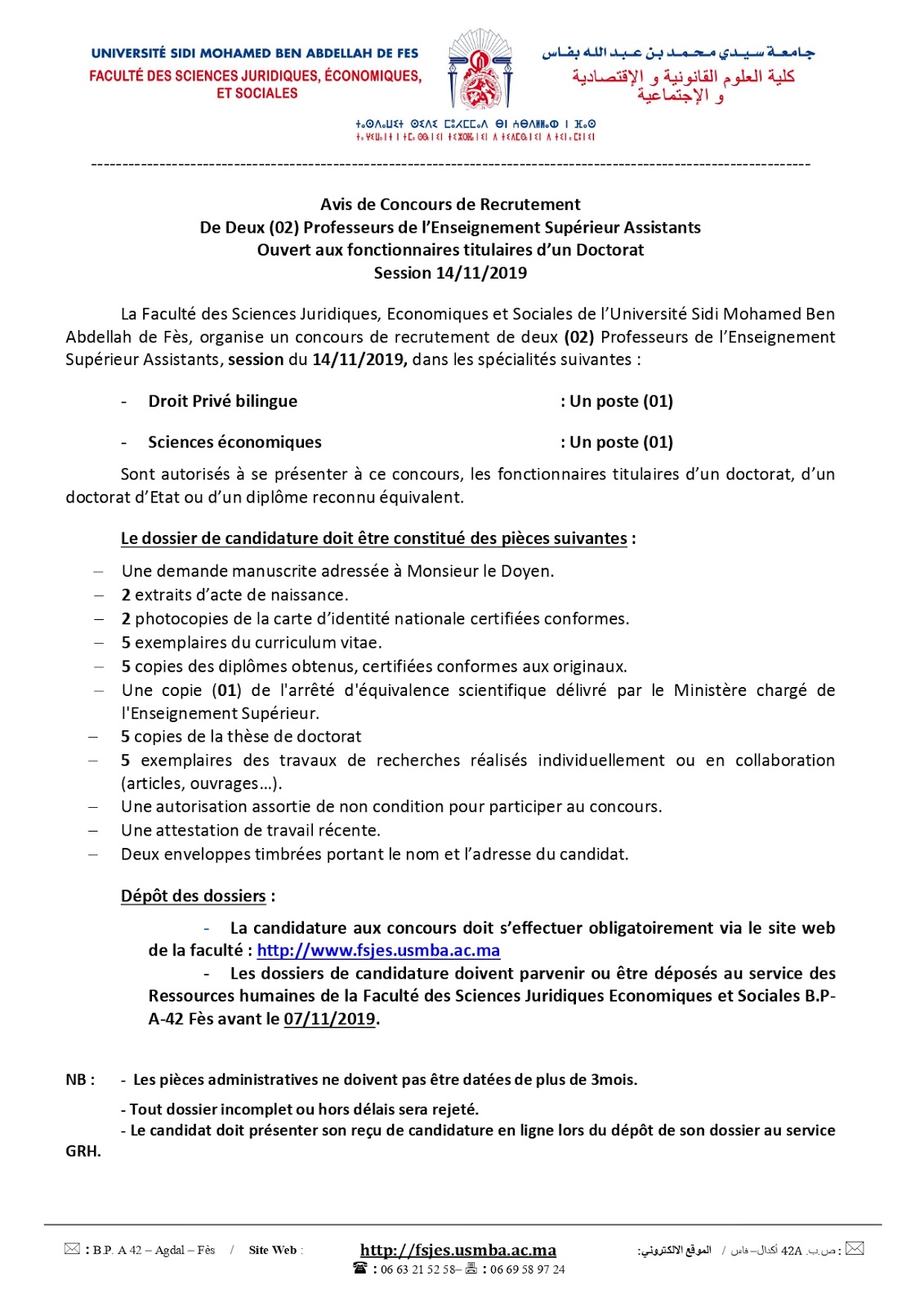 كلية العلوم القانونية والاقتصادية والاجتماعية فاس مباراة لتوظيف أستاذين للتعليم العالي مساعدين آخر أجل 7 نونبر 2019