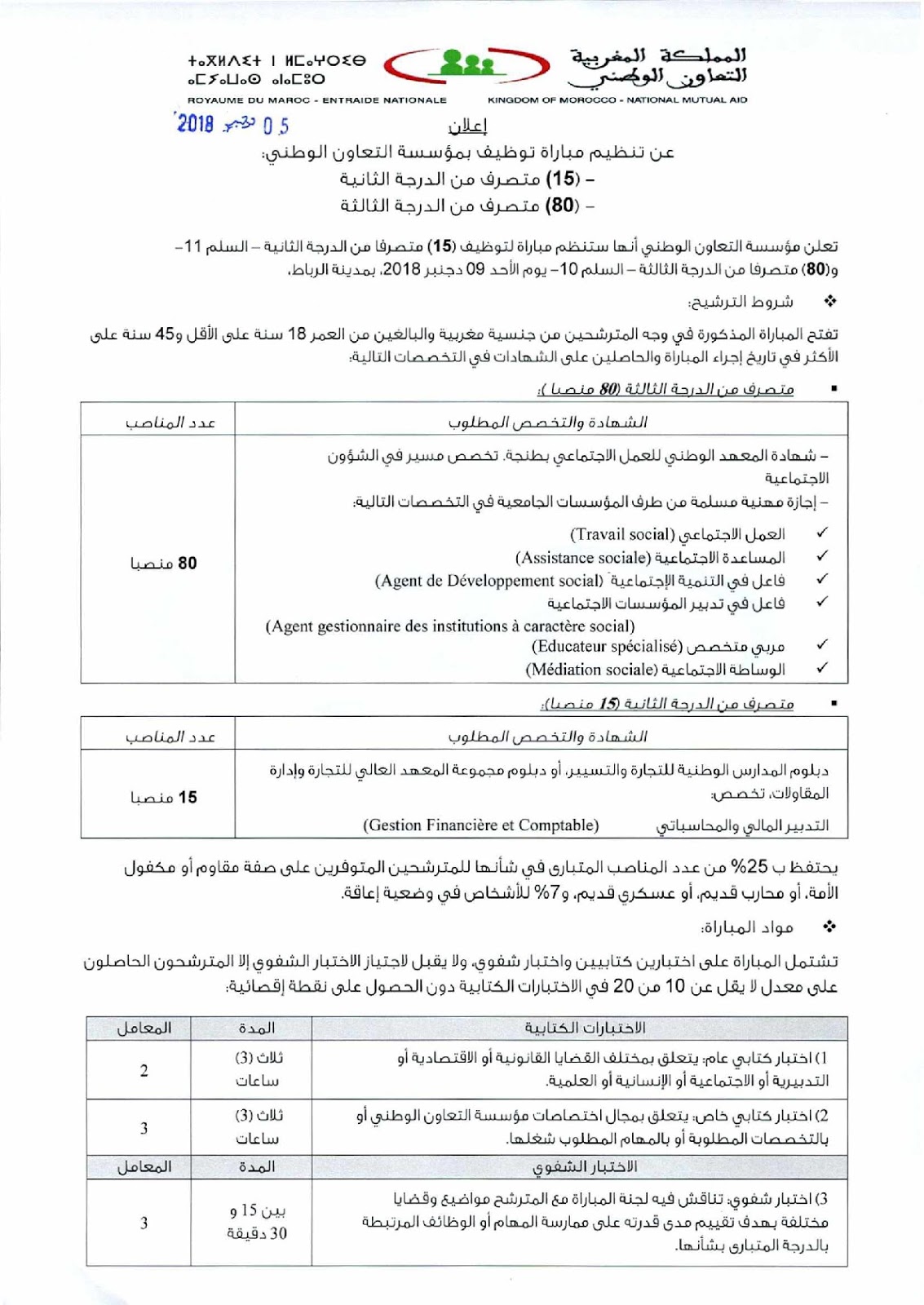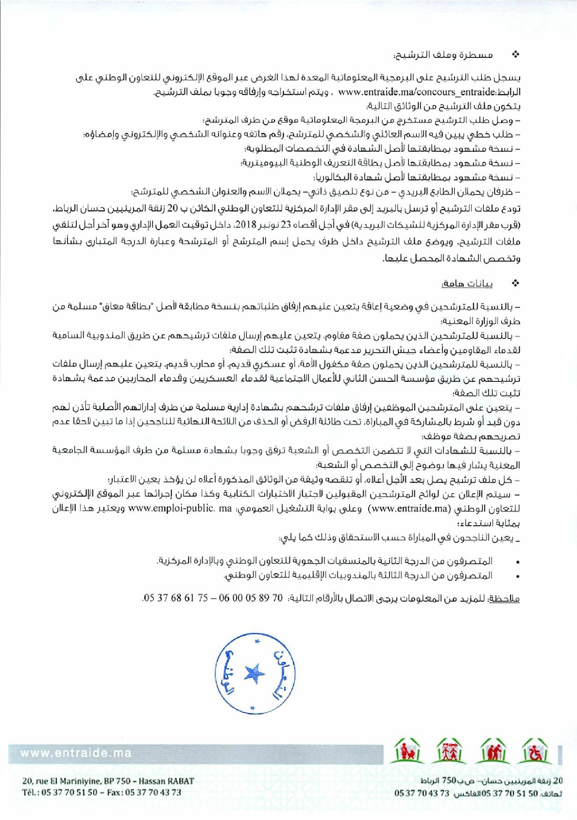 التعاون الوطني: مباراة توظيف 80 متصرف من الدرجة الثالثة و15 متصرف من الدرجة الثانية في عدة تخصصات. آخر أجل هو 23 نونبر 2018