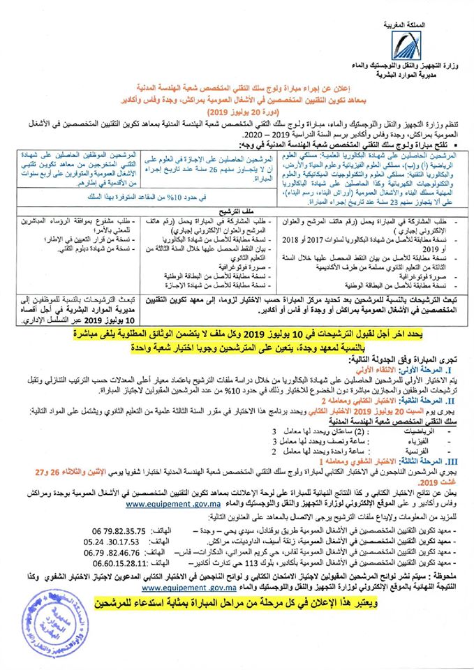مباراة ولوج سلك التقني المتخصص شعبة الهندسة المدنية بمعاهد تكوين التقنيين المتخصصين في الأشغال العمومية بمراكش ووجدة وفاس واكادير 2019