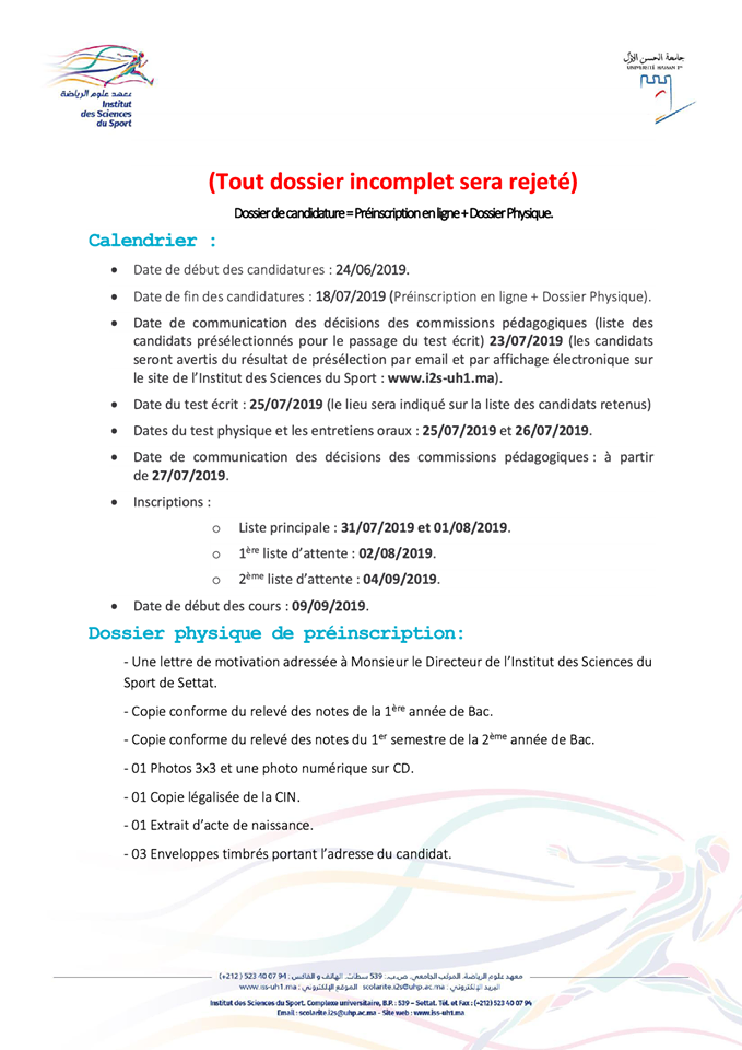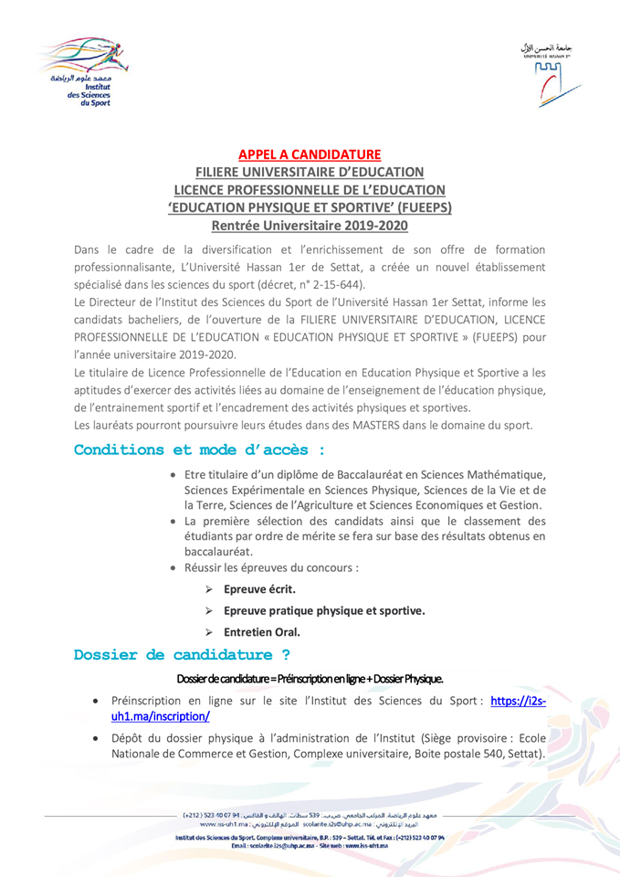 معهد علوم الرياضة بسطات مباراة ولوج السنة الاولى من الاجازة المهنية في التربية البدنية و الرياضة آخر آجل 18 يوليوز 2019