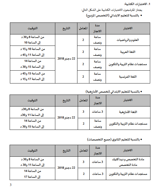 Alwadifa Maroc / Alwadifa TAALIM / Autres offres d'emploi مواقيت اجراء الاختبارات الكتابية لمباراة التعاقد ليوم 22 دجنبر 2018 ShareSharePin It مواقيت اجراء الاختبارات الكتابية لمباراة التعاقد ليوم 22 دجنبر 2018 الوثائق المطلوبة من أجل المشاركة في مباريات التوظيف بموجب عقود توزيع المناصب الخاصة بمباراة التعاقد بالأكاديمية الجهوية للتربية والتكوين تحميل التزام المترشح الخاص بمباراة التوظيف بالتعاقد