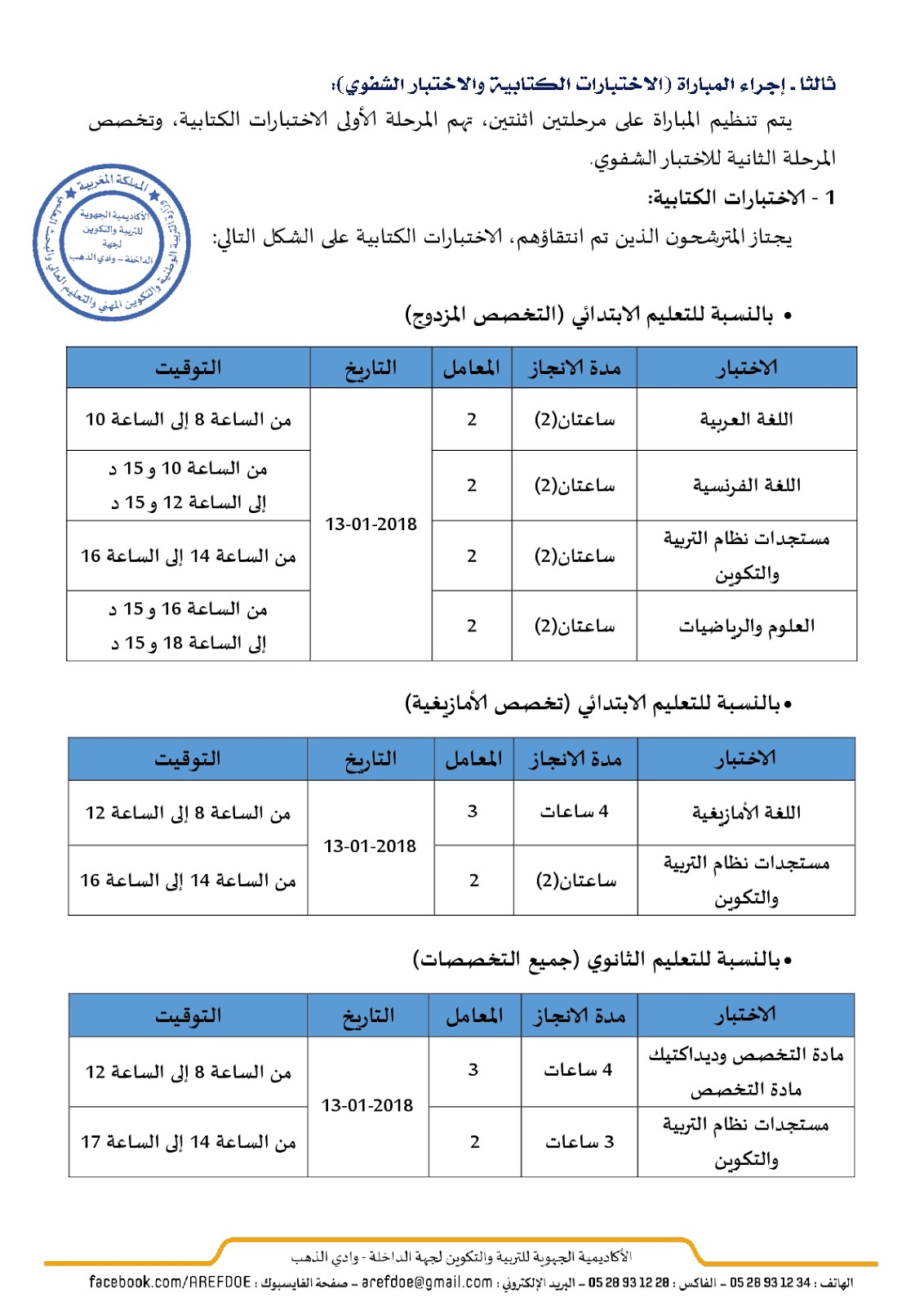 Alwadifa Dakhla / Alwadifa Maroc / Alwadifa TAALIM / Autres offres d'emploi / Offres d'emploi Licence / Par fonction / Par ville / Voir les autres villes وظائف الأكاديمية الجهوية للتربية والتكوين لجهة الداخلة واد الذهب: مباراة توظيف 178 أستاذ(ة) متعاقد(ة). آخر أجل 9 يناير ShareSharePin It الأكاديمية الجهوية للتربية والتكوين لجهة الداخلة واد الذهب: مباراة توظيف 178 أستاذ(ة) متعاقد(ة). آخر أجل 9 يناير 2018 تحميل الإعلان