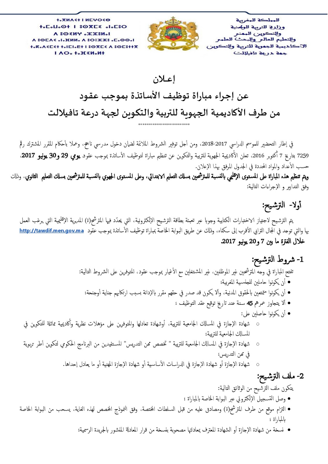 Alwadifa Errachidia / Alwadifa Maroc / Alwadifa TAALIM / Autres offres d'emploi / Par ville وظائف الأكاديمية الجهوية للتربية والتكوين لجهة درعة تافيلالت مباراة لتوظيف 1856 أستاذ بموجب عقد أخر أجل 21 يونيو ShareSharePin It الأكاديمية الجهوية للتربية والتكوين لجهة درعة تافيلالت مباراة لتوظيف 1856 أستاذ بموجب عقد أخر أجل 21 يونيو 2017