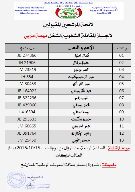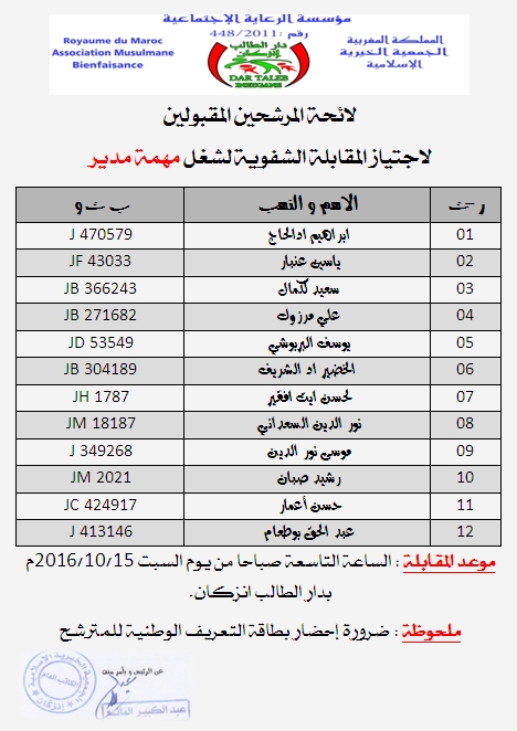 الجمعية الخيرية الإسلامية إنزكان المرشحين للمقابلة الشفوية لتوظيف مدير أو مديرية مؤسسة الرعاية الاجتماعية و02 مربين أو مربيتين؛ ليوم 15 أكتوبر 2016