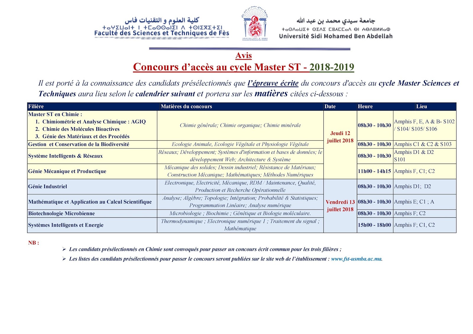 FST Fès Concours d’accès au cycle Master Sciences et Techniques – 2018-2019