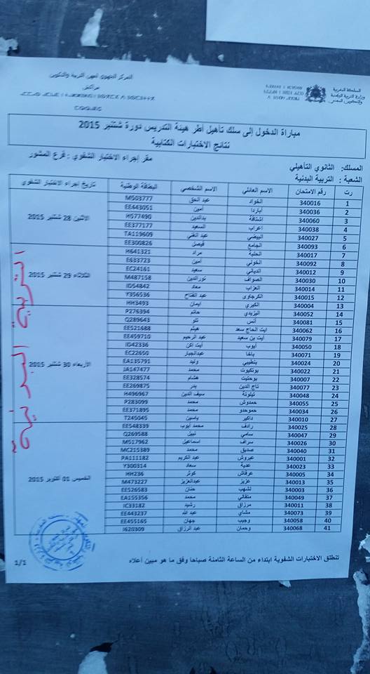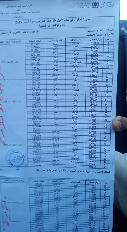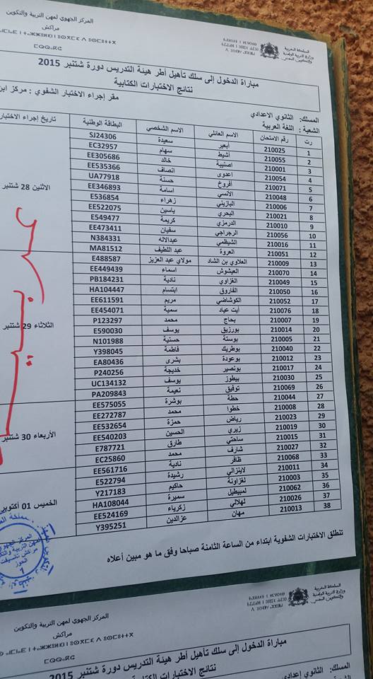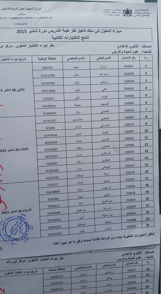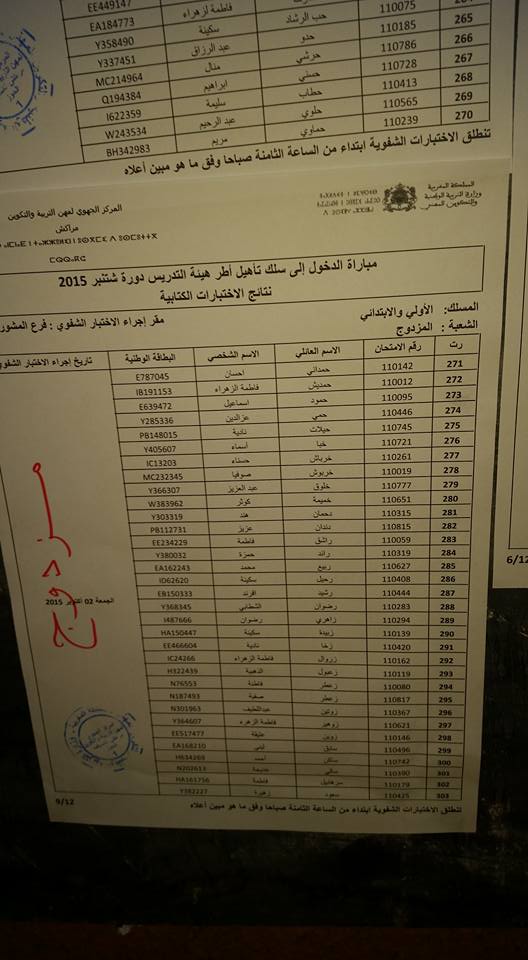 Alwadifa Marrakech / Par ville / Resultats du concours وظائف مراكش نتائج الإمتحان الكتابي من مباراة ولوج المراكز الجهوية لمهن التربية والتكوين ShareSharePin It مراكش نتائج الإمتحان الكتابي من مباراة ولوج المراكز الجهوية لمهن التربية والتكوين 2015-2016 مراكش ـ جميع الشعب ثانوي تأهيلي مراكش ـ إعدادي التربية الإسلامية و- التربية البدنية مراكش الإبتدائي مراكش إبتدائي أمازيغية مراكش