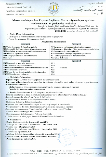 Master de Géographie. Espaces fragiles au Maroc : dynamiques spatiales, environnement et gestion des territoires 2016/2017 à la FLSH d’El Jadida