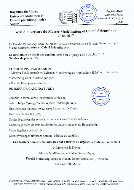 Master Modélisation et Calcul Scientifique à la Faculté Pluridisciplinaire de Nador 2016/2017